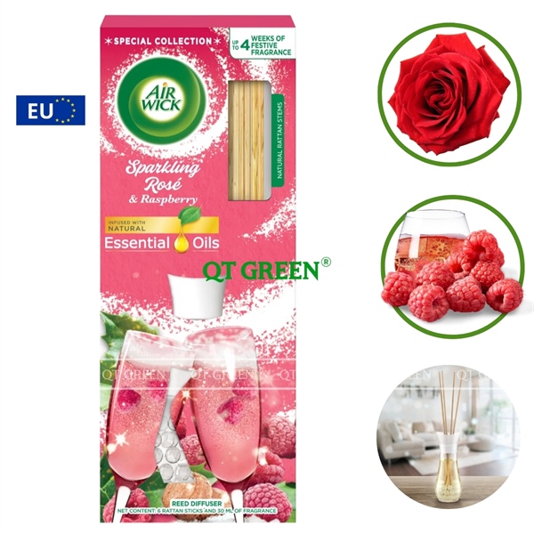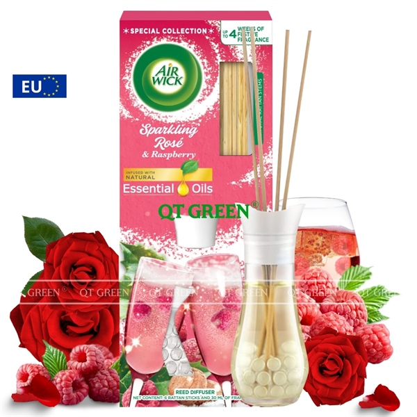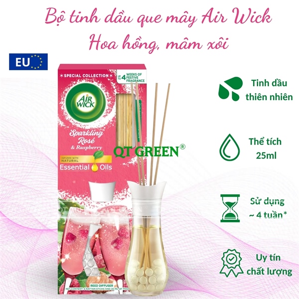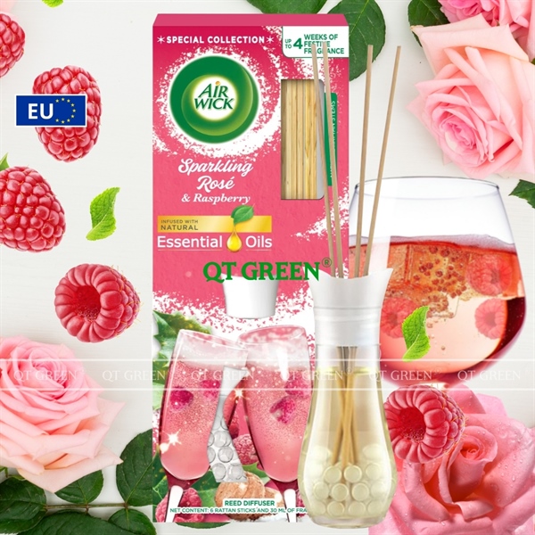 Bộ khuếch tán tinh dầu que mây Air Wick Reed Diffuser Essential Oils 25ml Sparkling Rose & Raspberry - hoa hồng, mâm xôi - Bộ