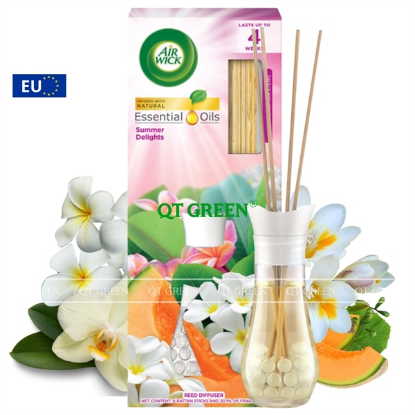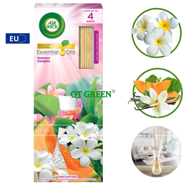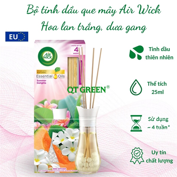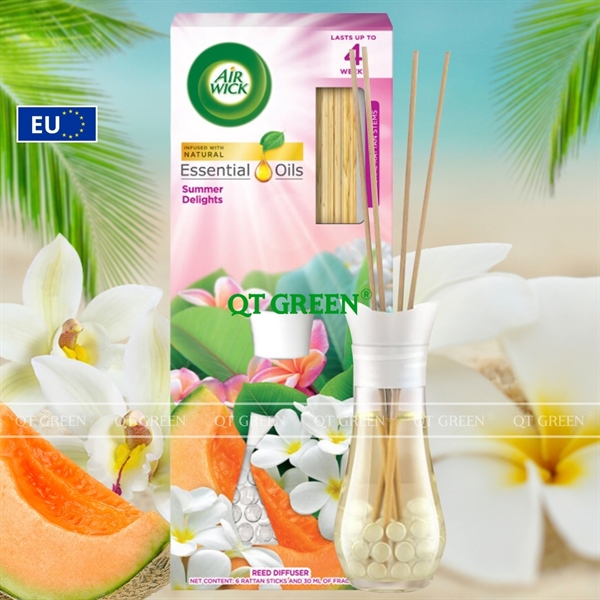 Bộ khuếch tán tinh dầu que mây Air Wick Reed Diffuser Essential Oils 25ml Summer Delights - hoa lan trắng, dưa gang - Bộ