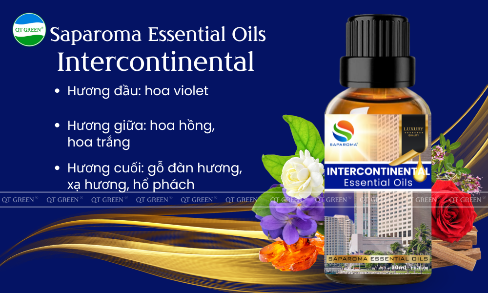 Mùi hương Intercontinental Essential Oils dẫn dắt khứu giác của bạn bởi sự tinh khiết nhẹ nhàng, bồng bềnh và lãng mạn với mùi hương của những bông hoa violet mang đến một trải nghiệm mềm mại, ngọt ngào. Sau đó là sự bùng nổ của hoa nhài, hoa linh lan và hoa hồng - những nốt hương hoa trắng đầy tinh tế. Để đến cuối cùng làn hương được lắng đọng lại với mùi xạ hương, hổ phách, hương gỗ êm dịu, sang trọng, lôi cuốn