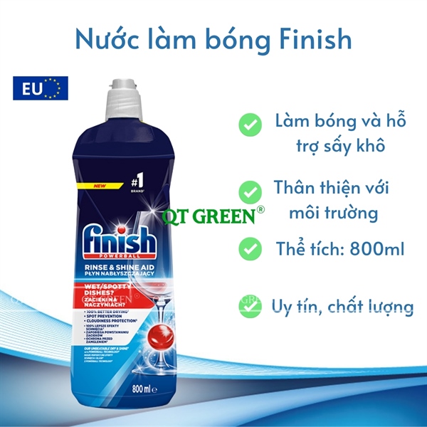 - Nước làm bóng và khô bát, đĩa Finish Rinse & Shine Aid là chất trợ xả cao cấp chuyên dụng giúp bát đĩa, ly cốc thủy tinh, dụng cụ nhà bếp khô nhanh hơn, bóng sáng hơn và không còn vết nước hay cặn khoáng sau khi rửa.