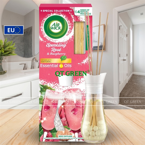 Bộ khuếch tán tinh dầu que mây Air Wick Reed Diffuser Essential Oils 25ml Sparkling Rose & Raspberry - hoa hồng, mâm xôi