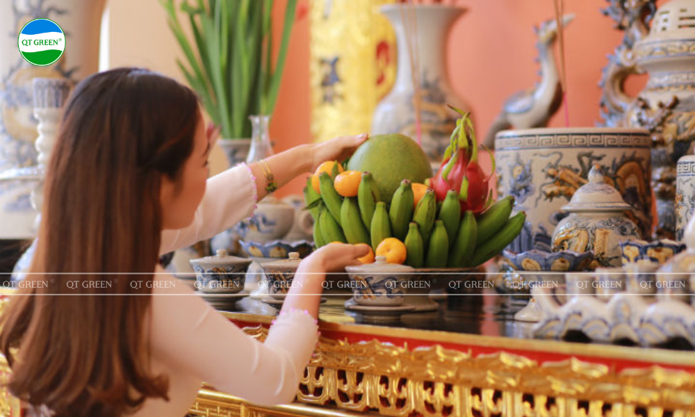 - Xếp đặt đồ cúng: sau khi lau bàn thờ sạch sẽ, bạn tiến hành xếp đặt đồ cúng lên bàn thờ. Nến thơm nên được đặt ở vị trí trung tâm của bàn thờ
