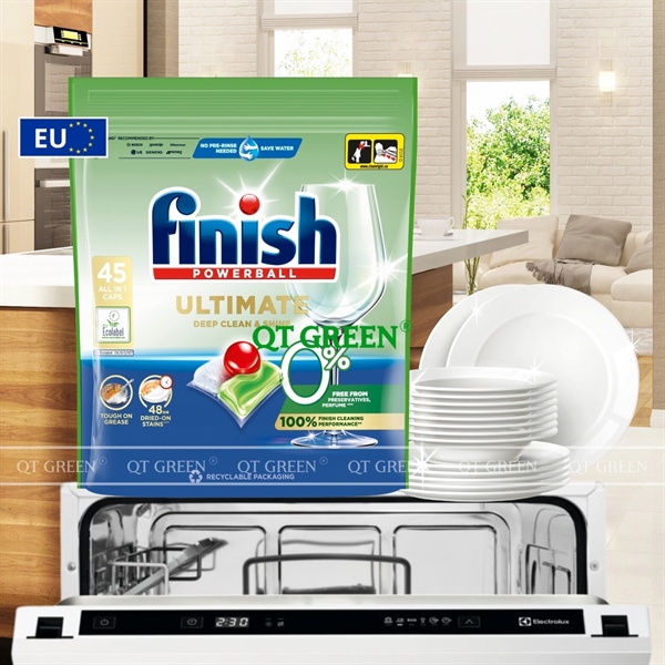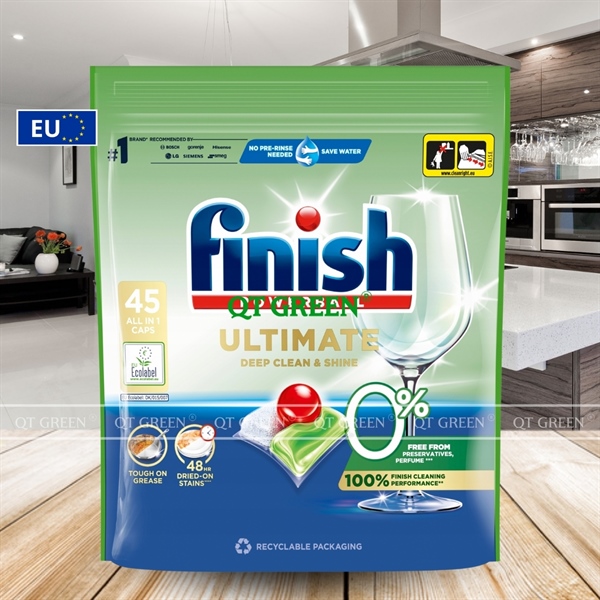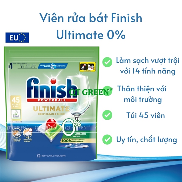 - Viên rửa bát Finish Ultimate Eco 0% là dòng sản phẩm viên rửa bát cao cấp hữu cơ kết hợp giữa hiệu quả làm sạch mạnh mẽ và thành phần an toàn, không hóa chất gây hại - lý tưởng cho mọi gia đình