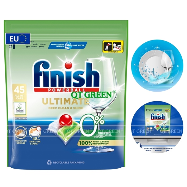 - Finish Ultimate Eco 0% không chứa hương liệu, chất chống tạo bọt hoặc chất bảo quản. Sản phẩm được dán nhãn sinh thái Ecolabel của EU, chứng nhận cho sự an toàn và thân thiện với môi trường